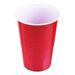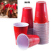 These red plastic cups are strong and sturdy, holding up to 16 fluid ounces of liquid each cup.