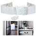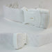 White colored strap measures approximately 9" Long. It has a self adhesive HOOK AND LOOP FASTENER loop strap and contains a key lock buckle in the middle.