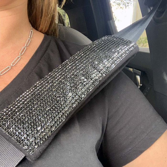 Crafted with soft padding and inlaid rhinestone crystals, this cover relieves shoulder pressure and helps prevent rubbing or chafing from standard seat belts. The Velcro closure makes installation simple just wrap it around your seat belt, press to secure, and enjoy instant comfort and style.