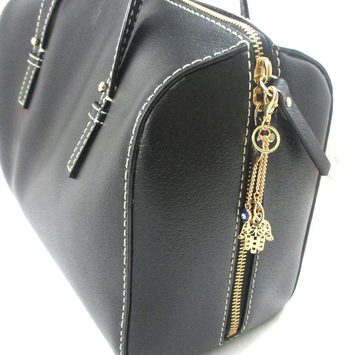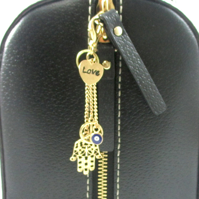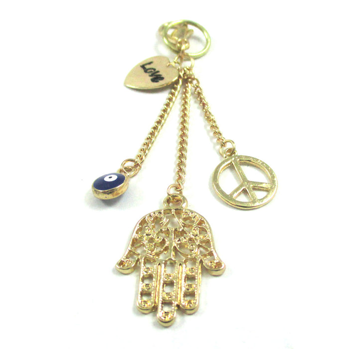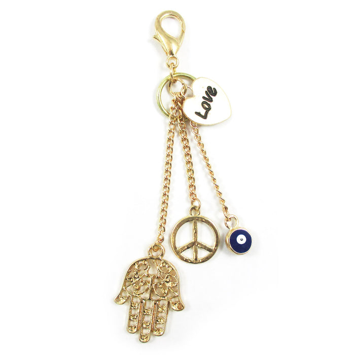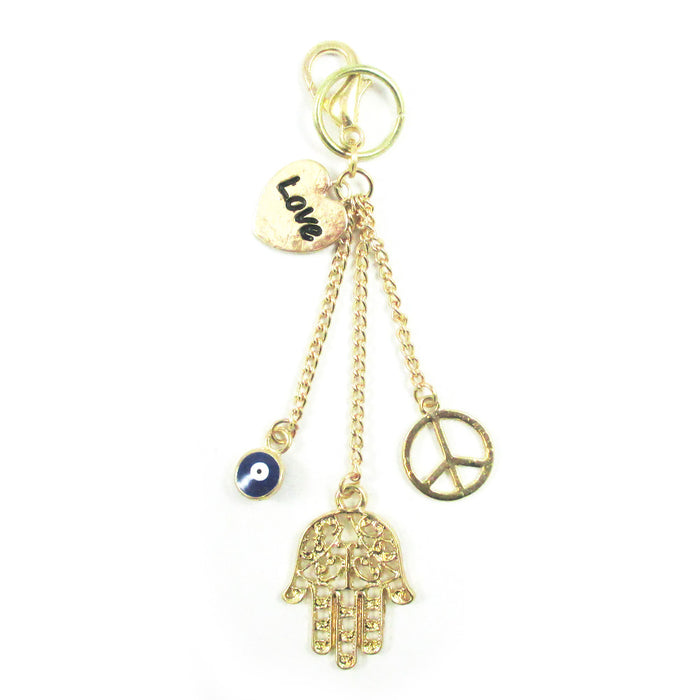 Gold plated purse accessory with a hamsa, blue evil eye, hear with "Love" (written) and peace sign charm.