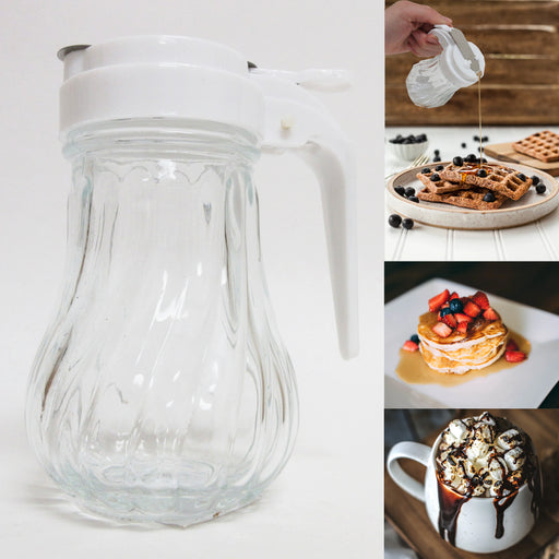 ATB16 reviews9 Oz Glass Syrup Dispenser Honey Maple Syrup Jar With Top Holder ! The new syrup dispenser is 3.2"X4.8"h and features a ma lid that swings open w...