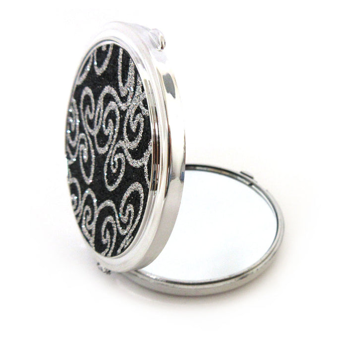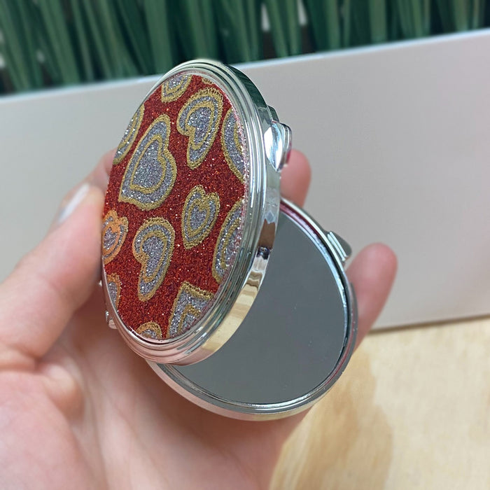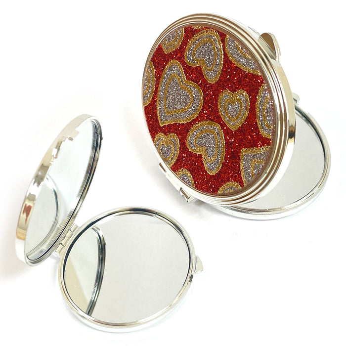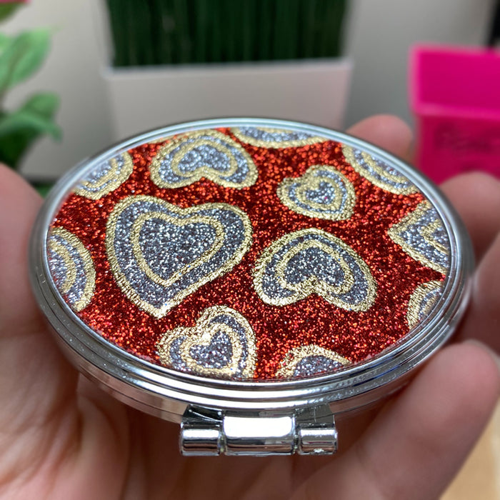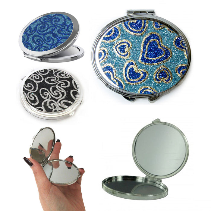 This folding double glitter mirror compact measures: 3" x 2.5 approximately. Perfectly fits into purses, backpacks, office drawers and more. Great for detailed application of make-up or eyebrow grooming.