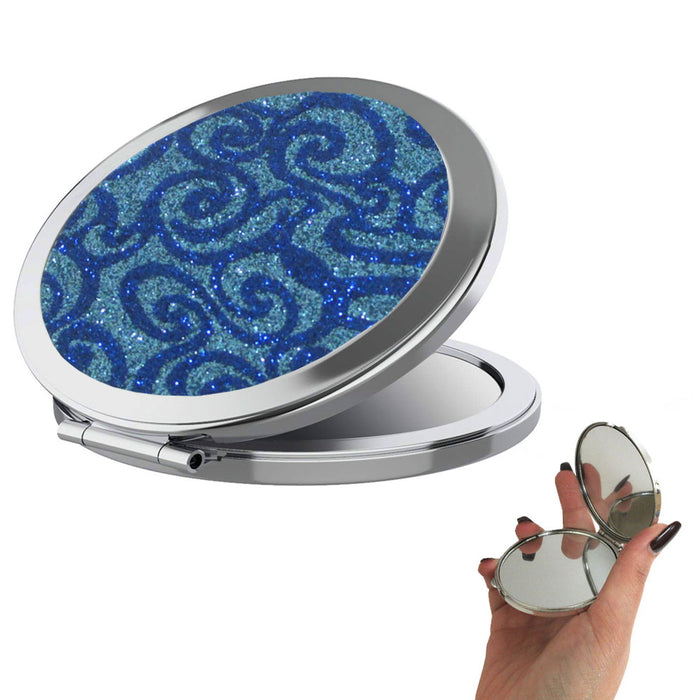 Great for travel and on the go, simple, attractive design features a blue glitter white design. One side is standard glass and the other side is magnified, lightweight and durable material.