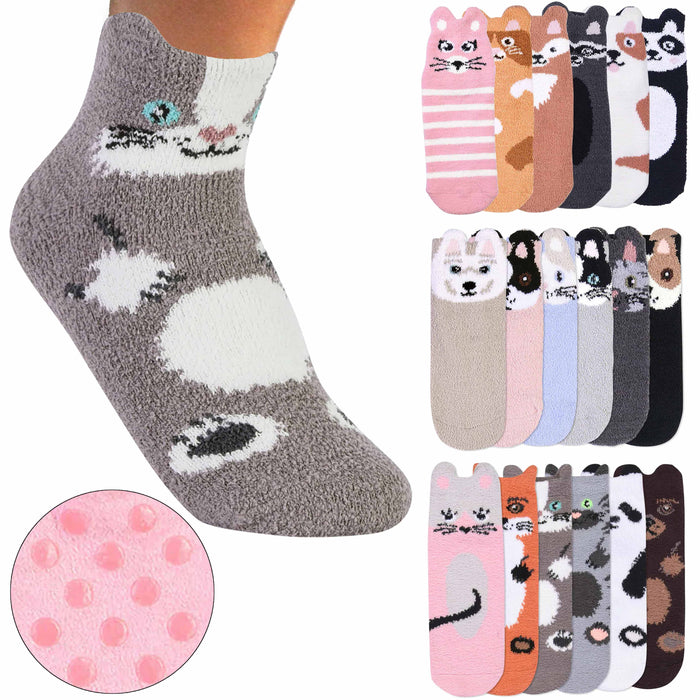 2 Pairs Women's Soft Cozy Fuzzy Socks Ankle Non-Skid Grip Animal Slipper 9-11