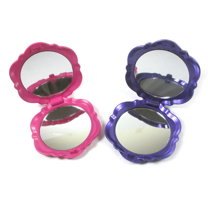 This rose folding double mirror compact measures: 3” Diameter approximately. Perfectly fits into purses, backpacks, office drawers and more. Great for detailed application of make-up or eyebrow grooming.