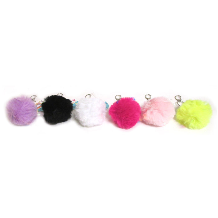 Be uptown playful with this faux pom poms fur fun colors of pom puff key chain with matching suede like tassels.