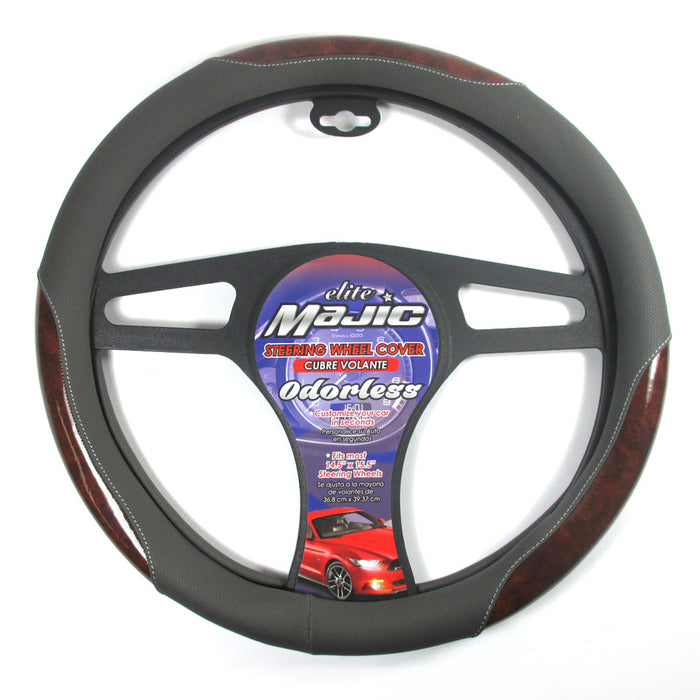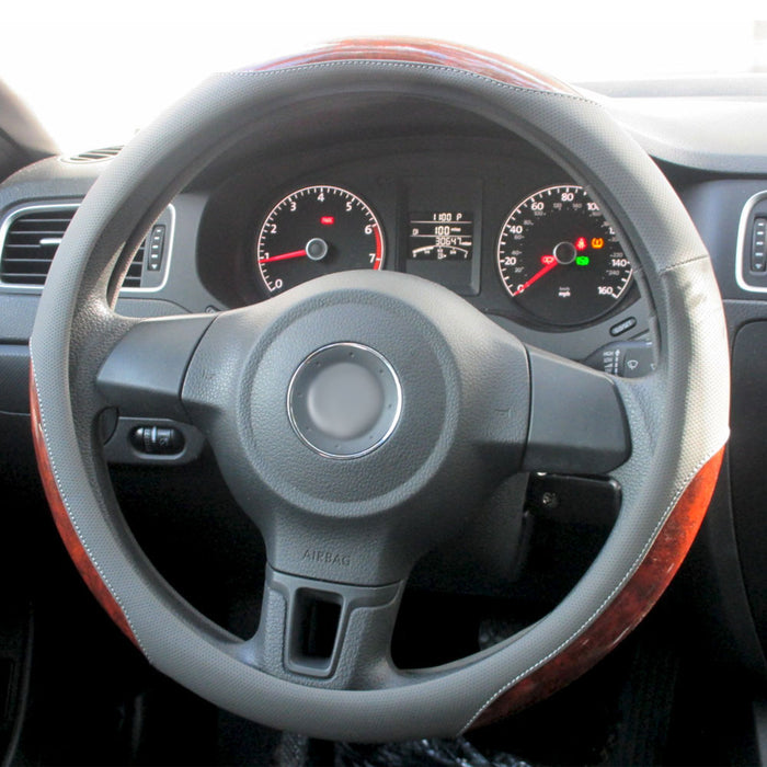 This steering wheel cover comes in grey with wood details for a more elegant and nicer look.