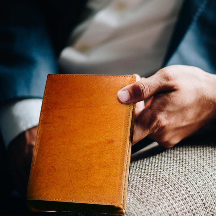 This leather business card holder book is as stylish as it is convenient.