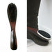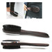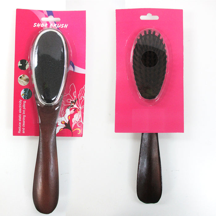 Wooden shoe brush with shoe horn handle cleans lint piling and reduces static electricity, measures 11" height.