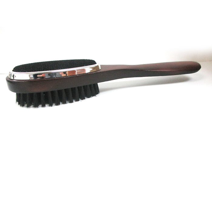 Made of Brown wood, 3 in 1 clothes brush, 100% boar bristles and chrome accents, clothes brush, lint brush and shoe horn.