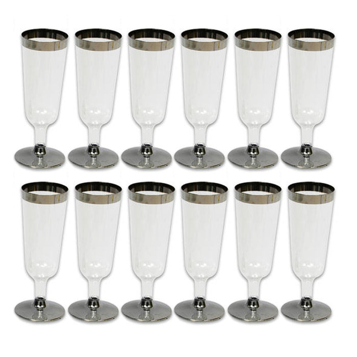 12 Pc Champagne Flute Wedding Party Plastic Silver Rimmed Disposable Wine Glass