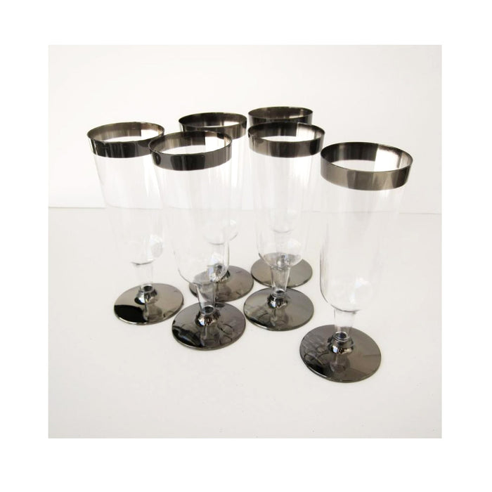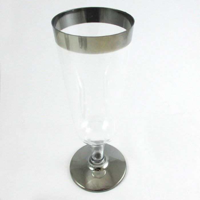 Reflections 12 piece rigid plastic champagne glass with silver base and trim.