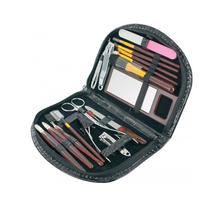 2 Cuticle Pushers, 1 Eyeshadow Sponge Brush, 2 Nail Files, 1 Cuticle Trimmer, 1 Eyelash Comb, 1 Eyebrow Scissors, 1 Ear Cleaner, 3 Nail Clippers (toe, small, large), 1 Tweezers, 1 Mirror, 1 Powder Brush, 1 Eyebrow Brush, 1 Foundation Brush, and 1 Eyeliner Brush.