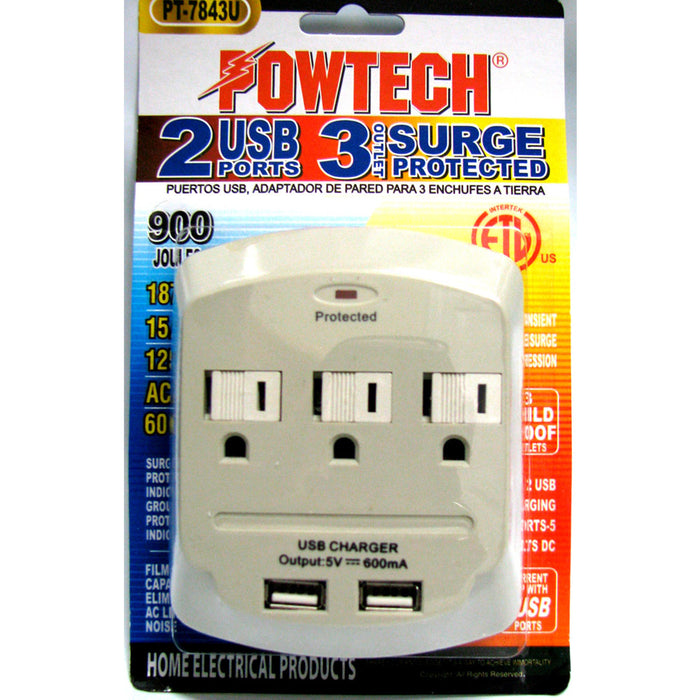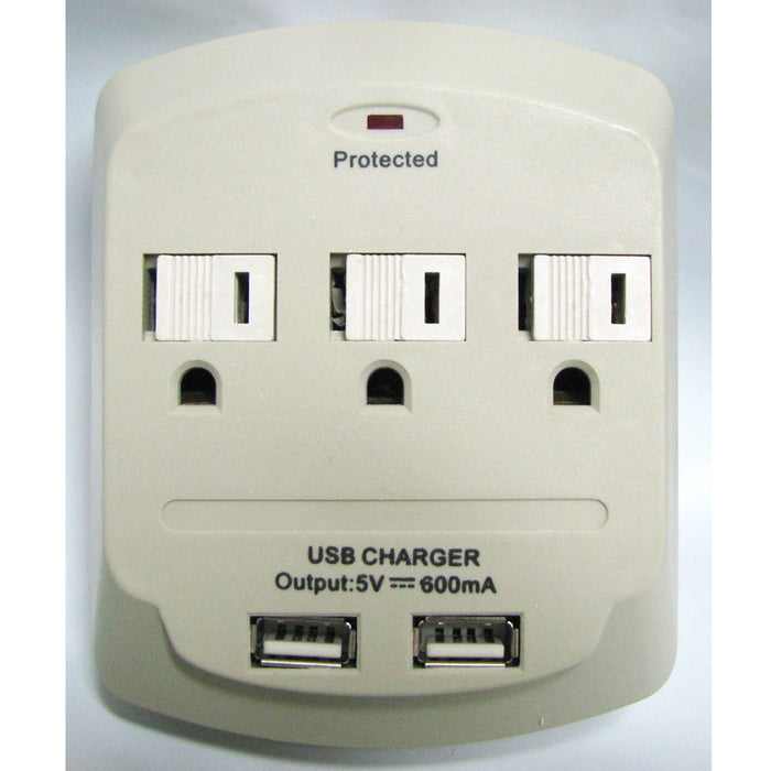 New 3 Outlet Power Surge Protector Wall Current Tap with 2 USB Ports, Child Proof, 900 Joules