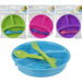 Plastic 3-Section Plate with Silverware Set comes with a plastic easy-grip spoon and fork.