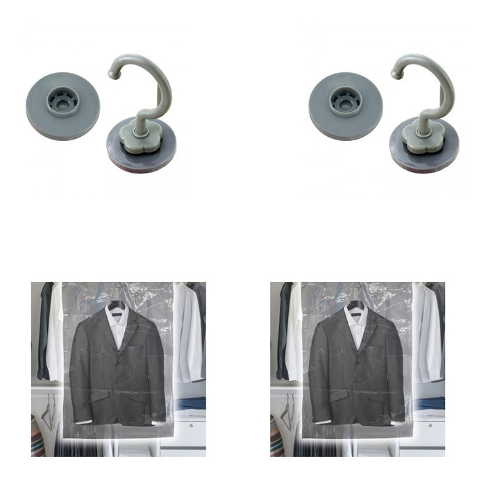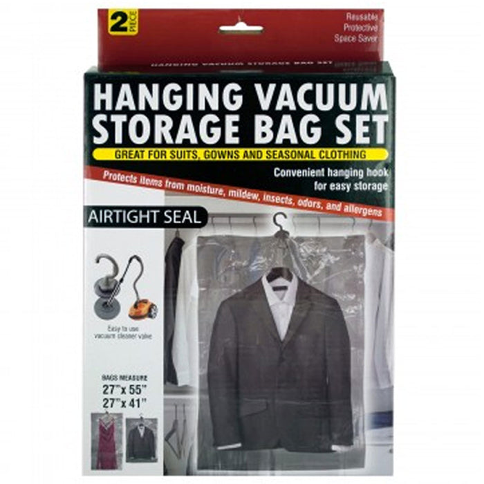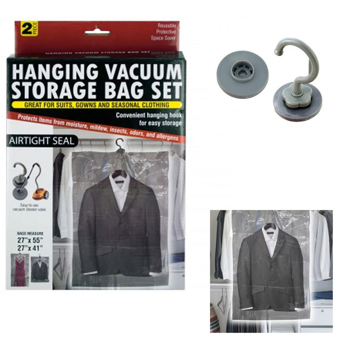 This 2 piece Hanging Vacuum Storage Bag Set featuring durable transparent plastic bags with airtight seals and convenient hanging hooks for easy storage. Bags measure approximately 27" x 55", 27" x 41"