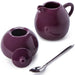 Elegantly serve coffee or tea with this 3-piece Purple Stoneware Sugar & Creamer Set featuring dark purple ceramic containers with a stainless steel sugar spoon.