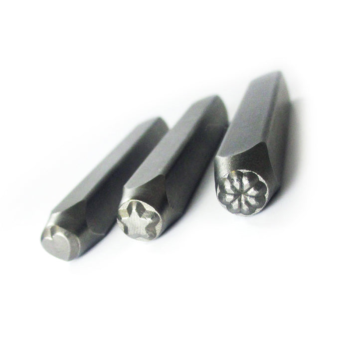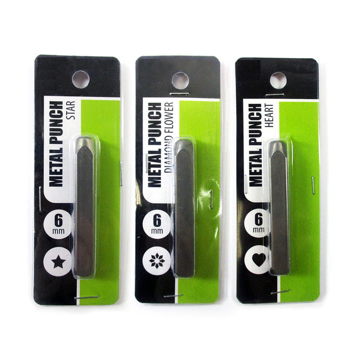This compact, easy-to-use set includes 3 metal design punches — a heart, diamond flower, and star — ideal for stamping on metal, leather, or other soft materials.