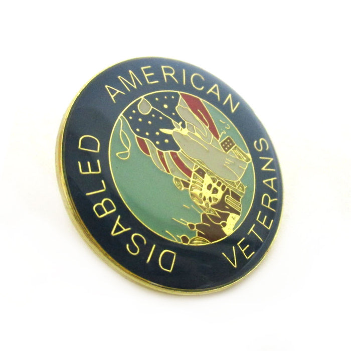 This stunning jewelry quality of Disabled American Veteran lapel pin is a must have for your collection. Made of brass with gold plating, this pin is 1" Diameter in size and has the official disabled american veteran colors in vivid enamel.