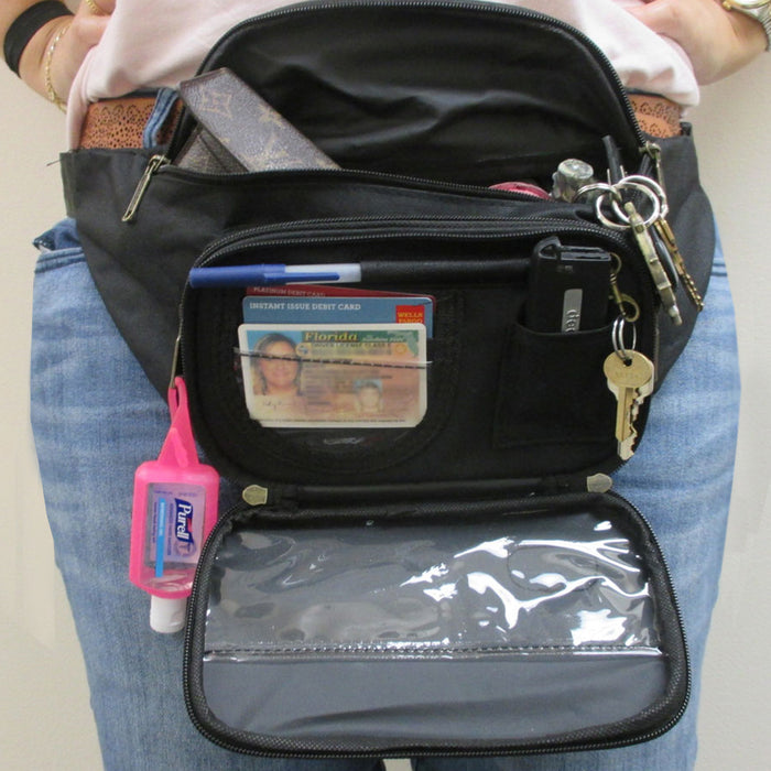 Fanny pack has 4 pockets and features an adjustable waistband that fits up to 47", comes with one (1) zippered compartment in the front with card holders, pockets, and a hook to attach your keys, two (2) zippered main compartments, plus one (1) zippered large compartment on the back for extra storage.