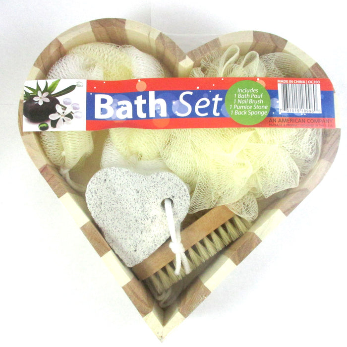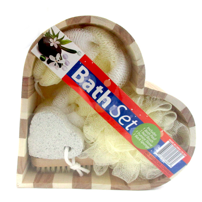The 5-piece gift set includes: 1 Bath Pouf,1 Nail Brush, 1 Pumice Stone, 1 Back Sponge, Wooden Heart Shaped Box