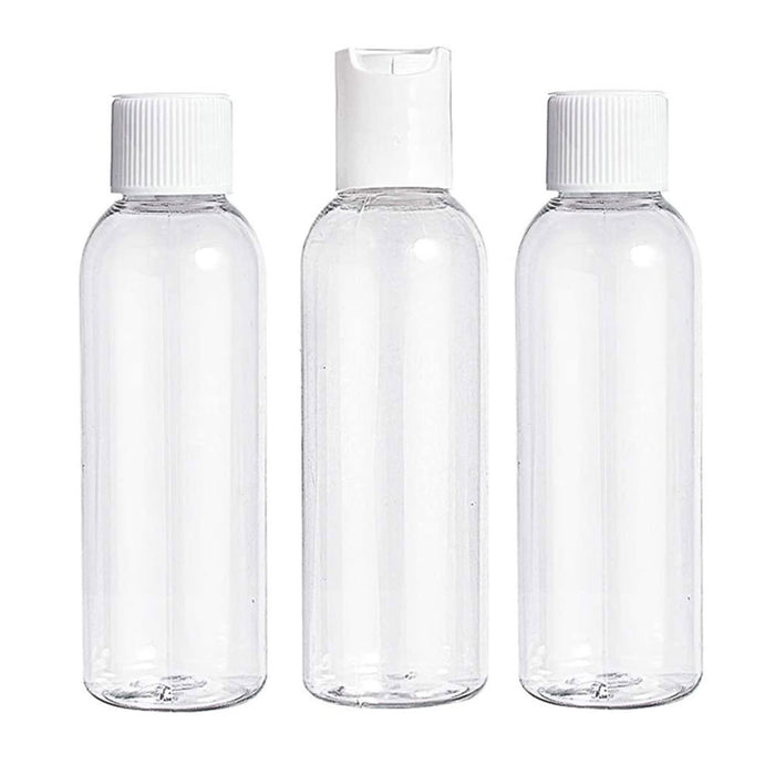Empty TSA approved approximately 60mL clear refillable plastic bottles.