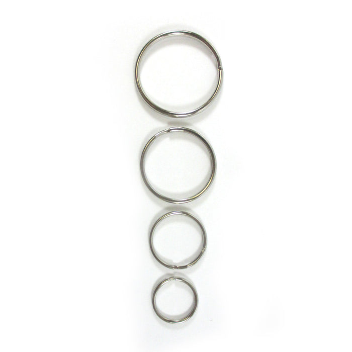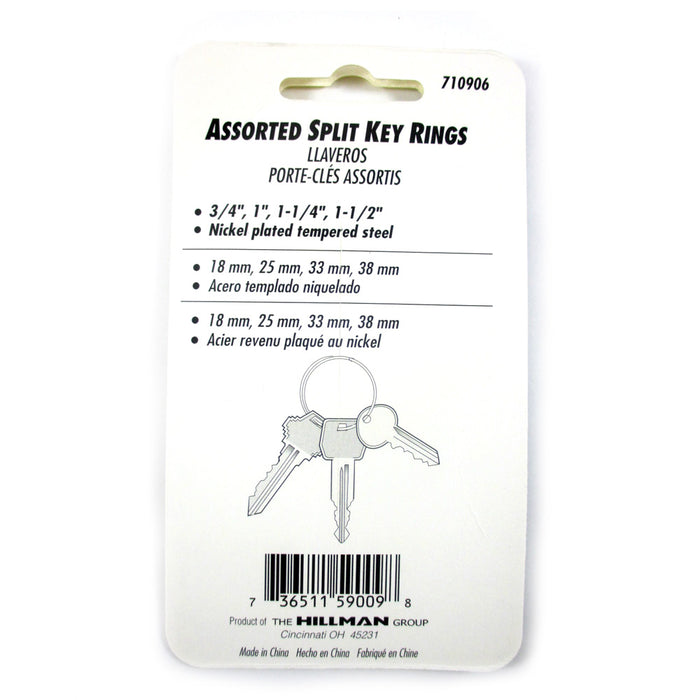 This handy 48 piece set of assorted split key rings comes with 4 different sizes per pack.