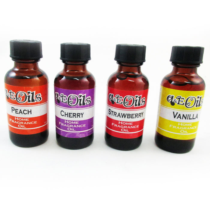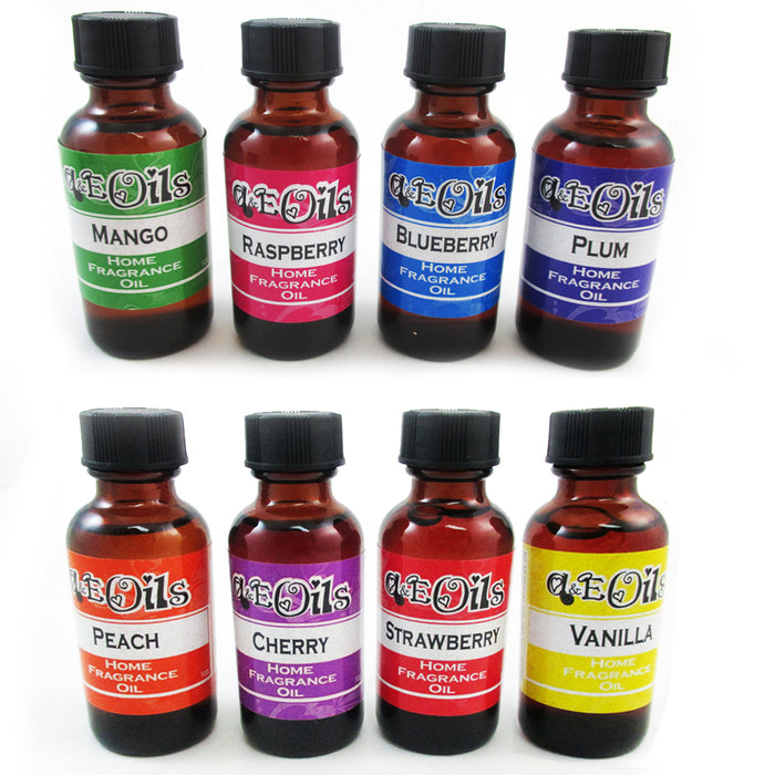 These burning fruit oils classic scent hold a capacity of 1 oz each, comes with 8 fragrances Mango, Vanilla, Strawberry, Plum, Blueberry, Raspberry, Peach, Cherry
