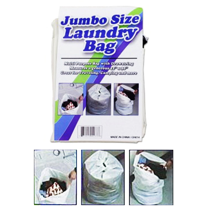 Perfect for laundry and clean-up, this jumbo size, durable, white multi-purpose plastic bag features a generous size with a drawstring closure.
