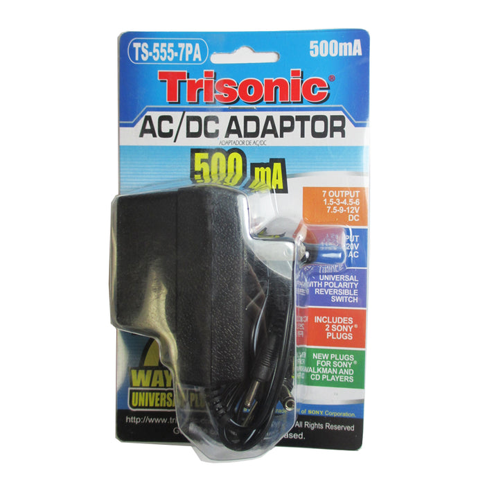 This adaptor converts house current to permit operation of battery powered units requiring any of the following voltages: 1.5, 3, 4.5, 6, 7.5, 9, 12V DC with a maximum current load of 500mA, and has 2 input voltages, 110V and 220V for you to select the same voltage in your area; North America uses 110V and Europe uses 220V.