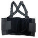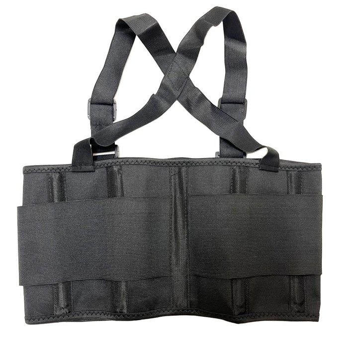This back support belt features adjustable suspenders and elastic outer panels for added comfort.