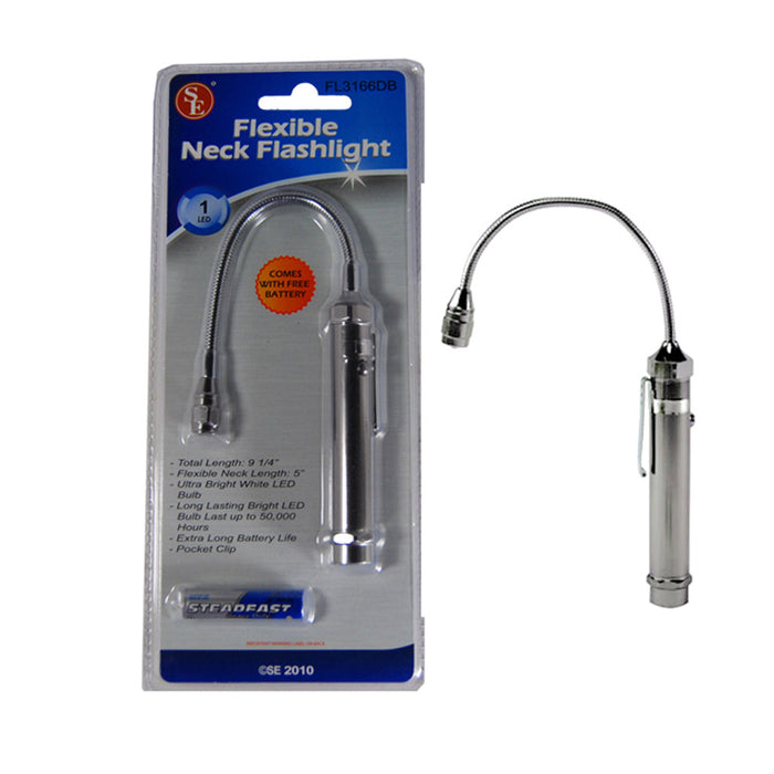 This flexible neck flashlight measures: 9 1/4" total length with a 5" neck length. 1 super bright light with white LED bulb.