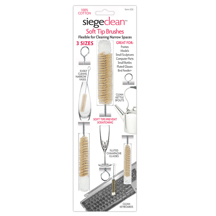 The soft tip brushes are flexible for cleaning narrow spaces. These brushes are great for cleaning frames, models, small sculptures, computer parts, small bottles, fluted glasses, bird feeders, hookah tubes and so much more.