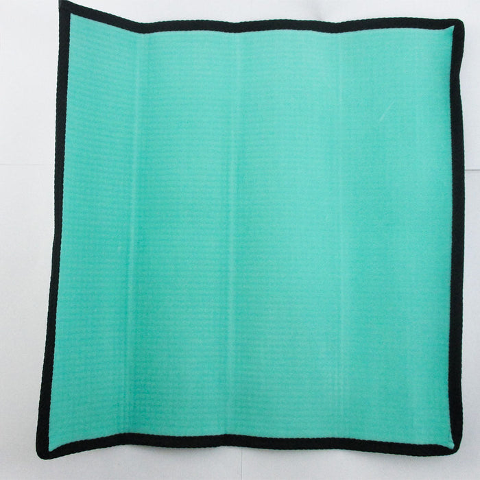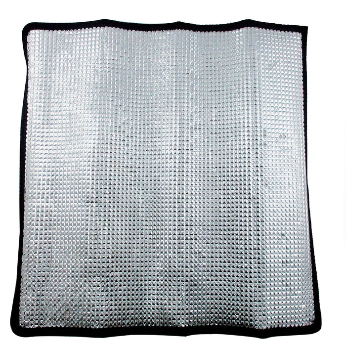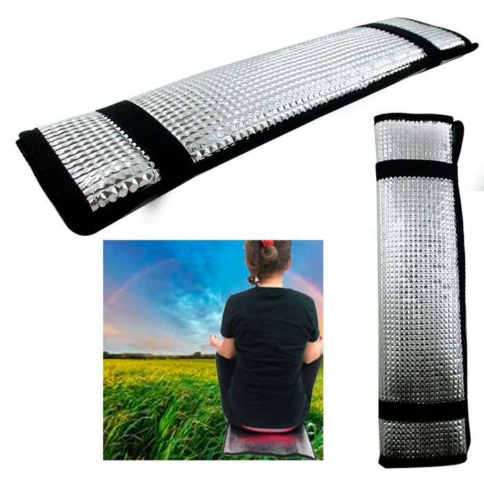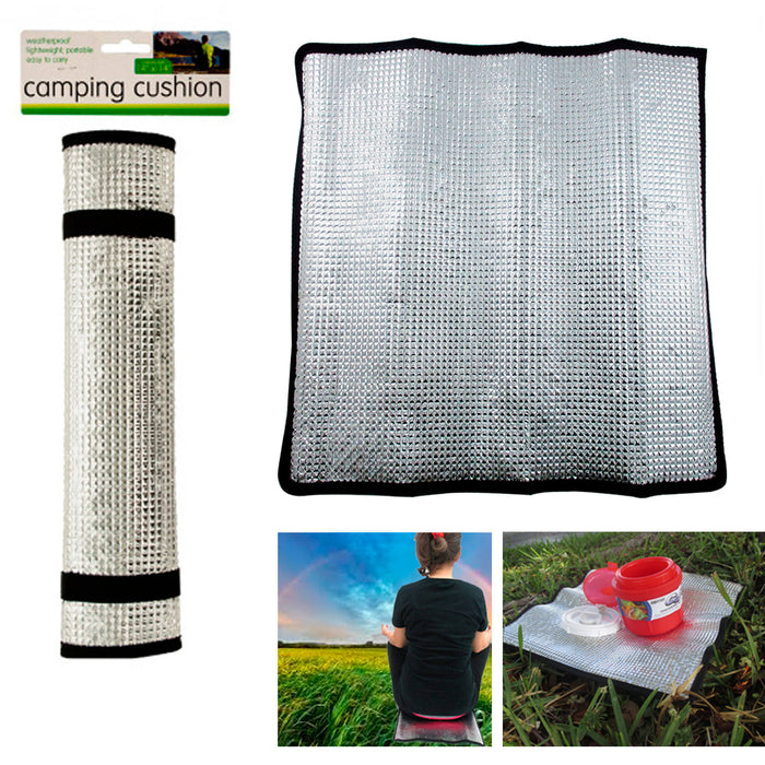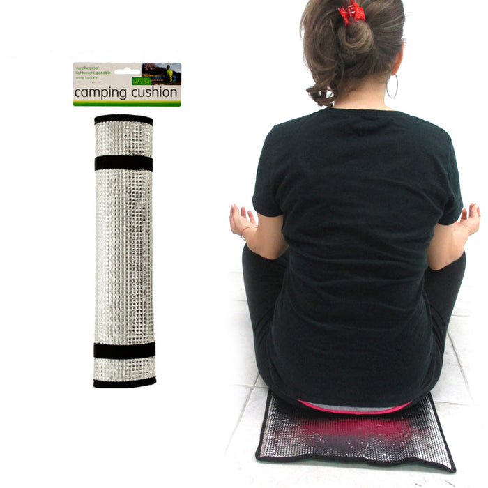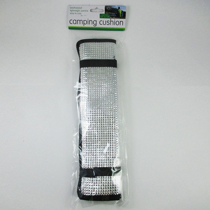 Convenient design features a foam padded cushion with thermo-reflective backing that easily rolls up neatly with two elastic straps.