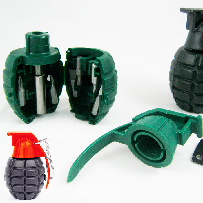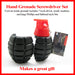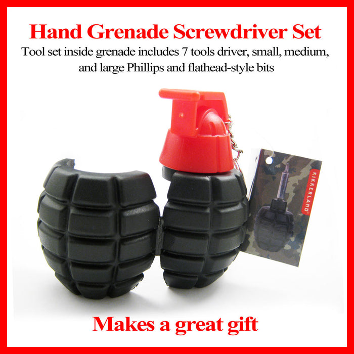 Set inside grenade includes driver, small, medium, and large sized Phillips and flathead-style bits to help you do the twist on all your screwy projects.