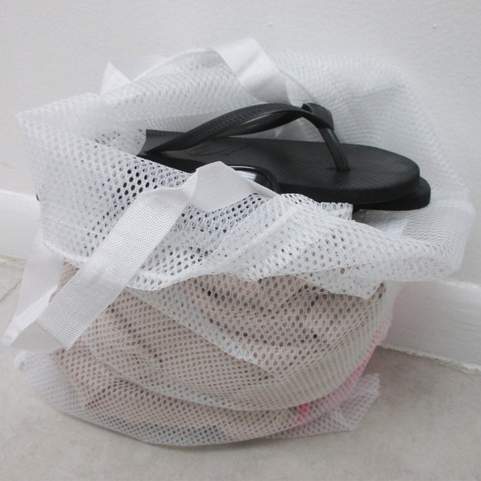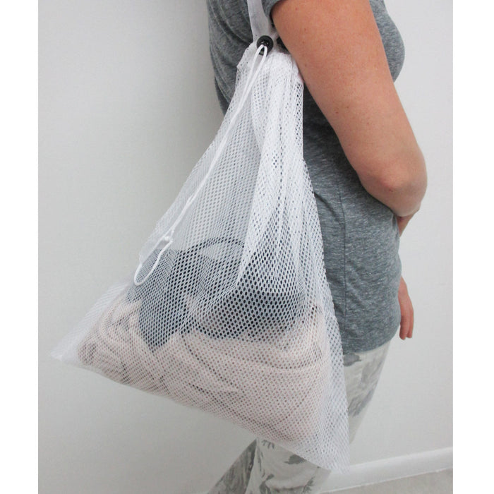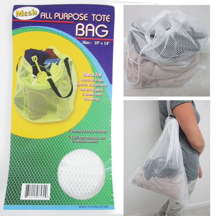 This all purpose white nylon mesh tote bag has heavy duty handles and a drawstring closure.
