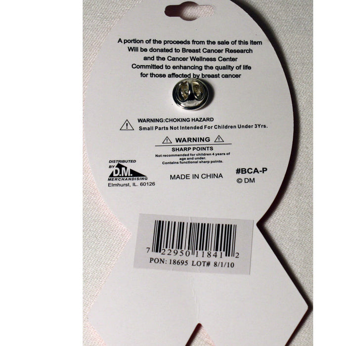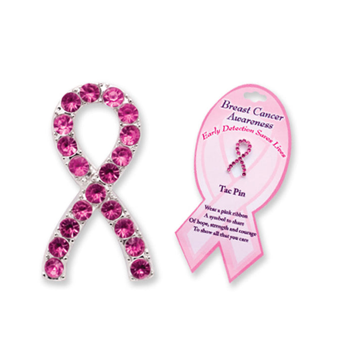 Feature: Genuine Austrian crystal, All Crystal Pink Ribbon Tac Pin, 1" high, Individually carded, Early Detection Saves Lives.