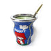 This Caminito Tango mate gourd is made out of glass on the inside covered on the outside with a beautiful print stitching, and a metal rim on the top.